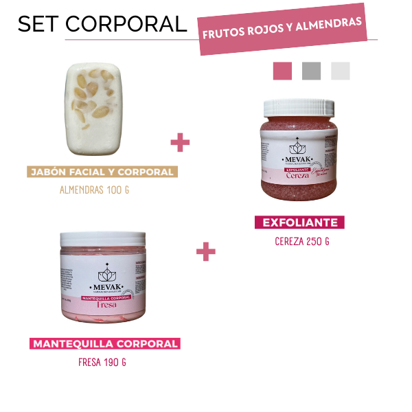 Descubre una piel suave y radiante con nuestro Set Corporal de Frutos Rojos y Almendras. Incluye un jabón de almendras para limpiar suavemente hidratando, humectando y relajando la piel, un exfoliante de cereza para eliminar las células muertas, limpiar y desintoxicar los poros y una mantequilla corporal de fresa para una hidratación intensa y duradera.